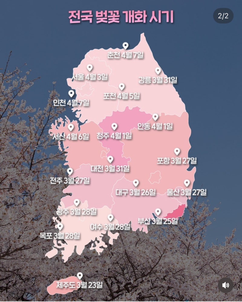 올해 벚꽃은 제주도를 시작으로 남부 지방, 중부 지방을 거쳐 4월 중순까지 북부 지역에서 개화할 예정입니다.