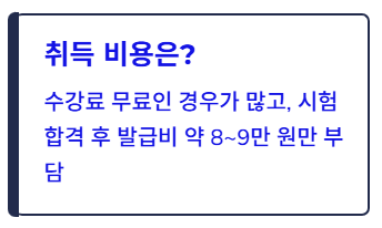 A. 교육원마다 다르지만, 보통 병원 동행서비스 자격증 수강료는 무료인 경우가 많고 시험 합격 후 발급비(약 8~9만 원)만 부담하면 되는 구조가 많습니다.