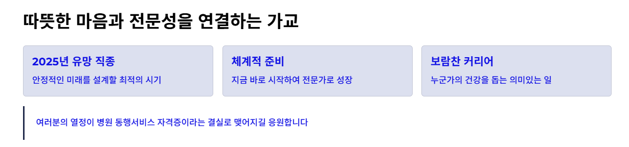 병원 동행서비스 자격증은 단순한 증서가 아니라, 따뜻한 마음과 전문성을 연결해 주는 가교입니다. 2025년 유망 직종인 만큼, 지금 바로 병원 동행서비스 자격증 취득에 도전하여 안정적인 미래를 설계해 보시기 바랍니다.